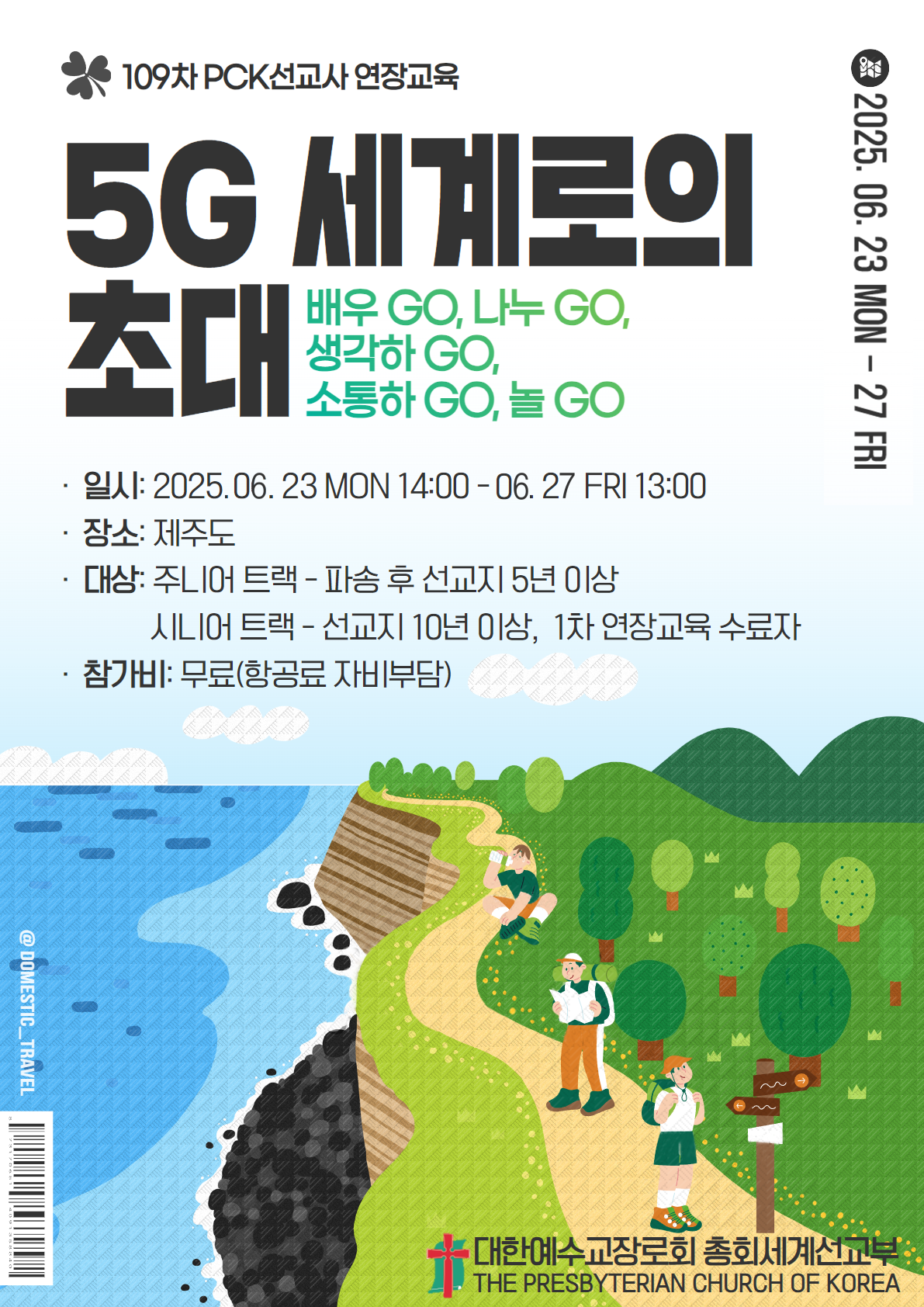-일시: 2025년 6월23일(월) 14:00 ~ 27일(금) 13:00 -신청서: 구글신청서 클릭 》》》 https://forms.gle/m6JwpdxuzjcbBfNWA -신청기한: 2025년 3월20일(목)~3월29일(토)까지(선착순 마감) -문의: 조정희 본부선교사(카톡ID:simchen25, 010-4436-0106) -프로그램: 첨부파일 참조 -기타: 후원교회 요청공문 신청가능