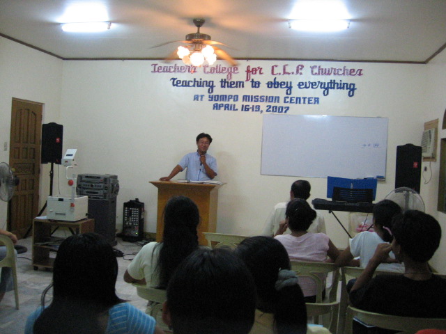 염포선교센터(앙헬레스,프랜드쉽)에서 열린 교사대학에 30여명의 수강자와 10여명의 강사및 도우미들이 수고해주셨습니다. 사진은 한경균 선교사 강의....본회 총무...