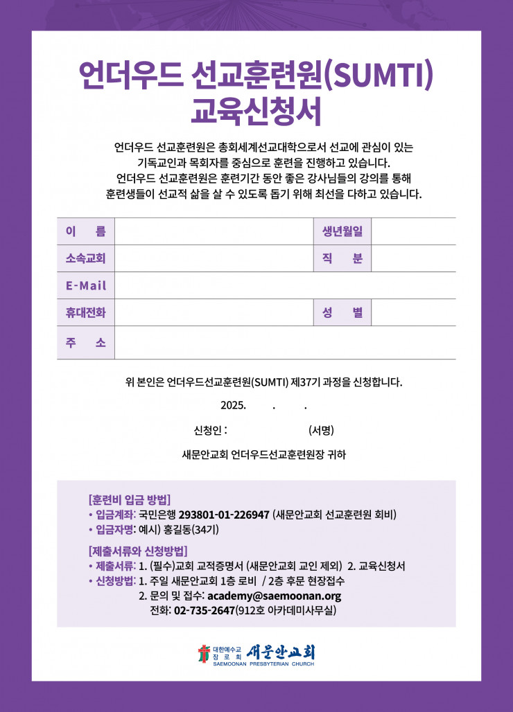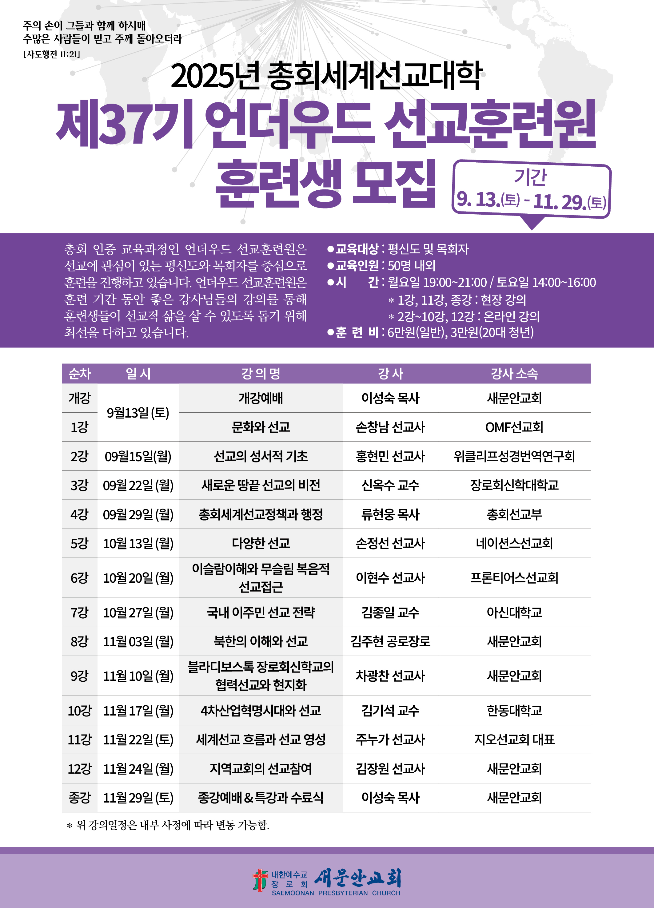 총회세계선교대학 개설안내(2025.9.13.~11.29. / 새문안교회 언더우드 선교훈련원)