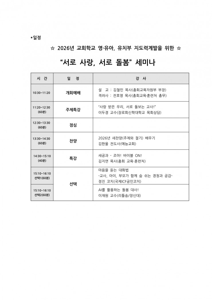 2026년 교회학교 영·유아, 유치부 지도력계발을 위한 “서로 사랑, 서로 돌봄” 세미나 안내
