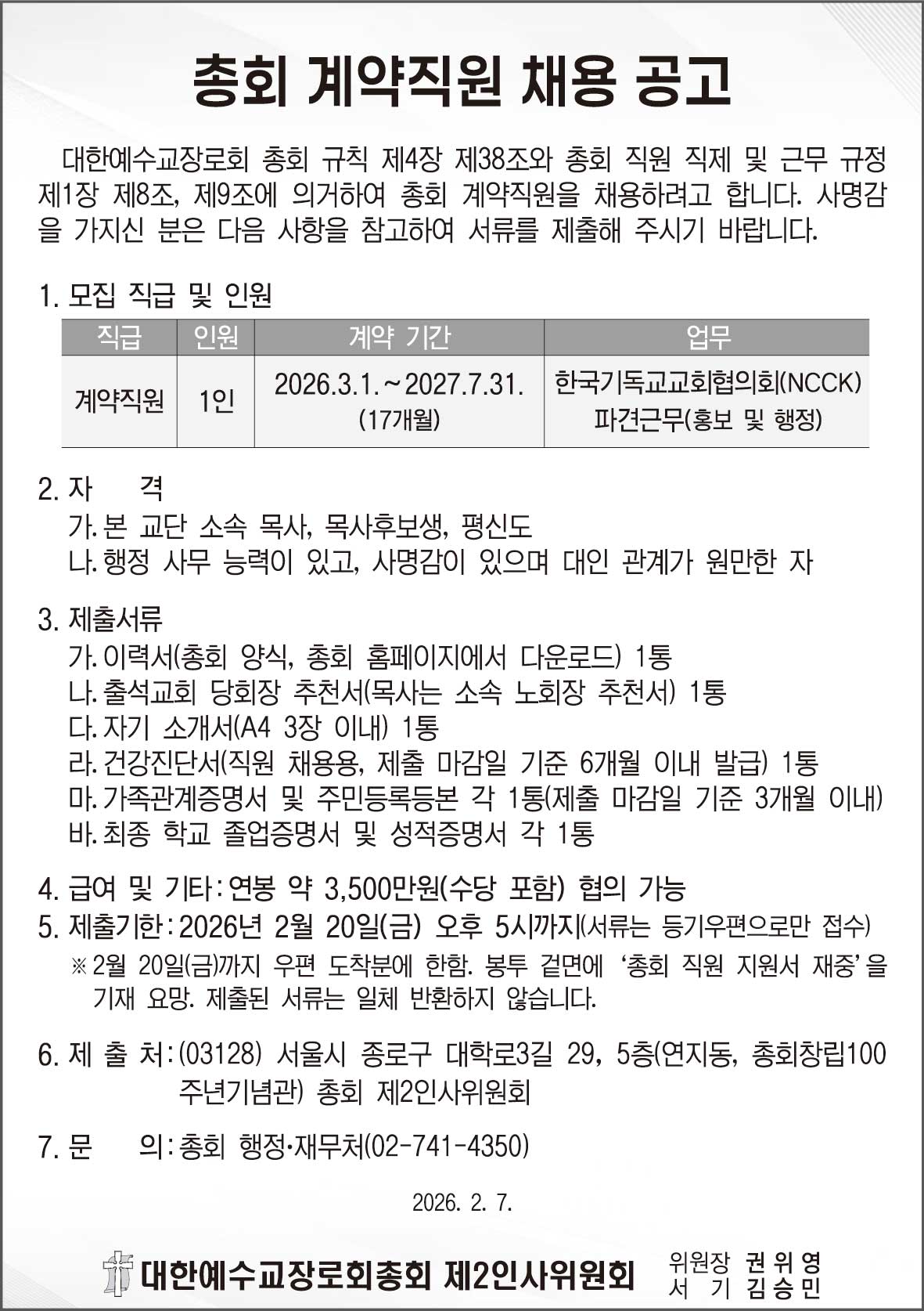 총회 계약직원 채용 공고