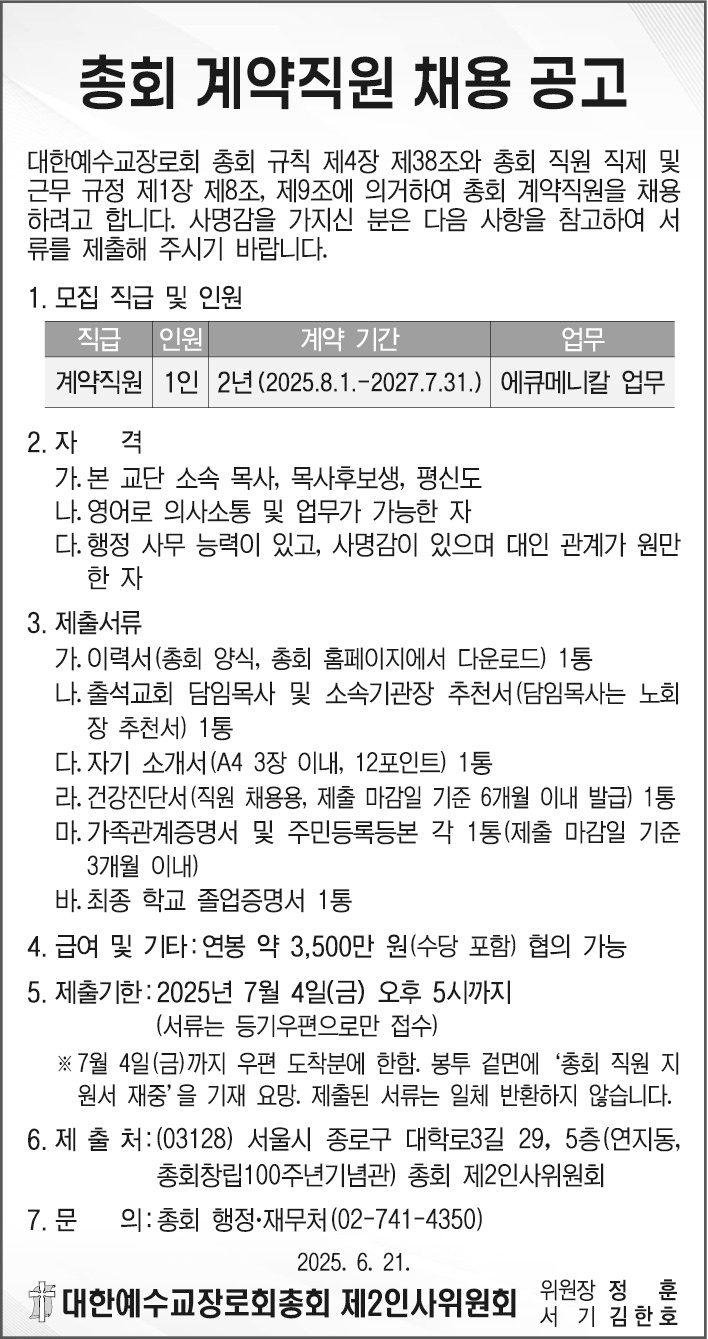 총회 계약직원 채용 공고