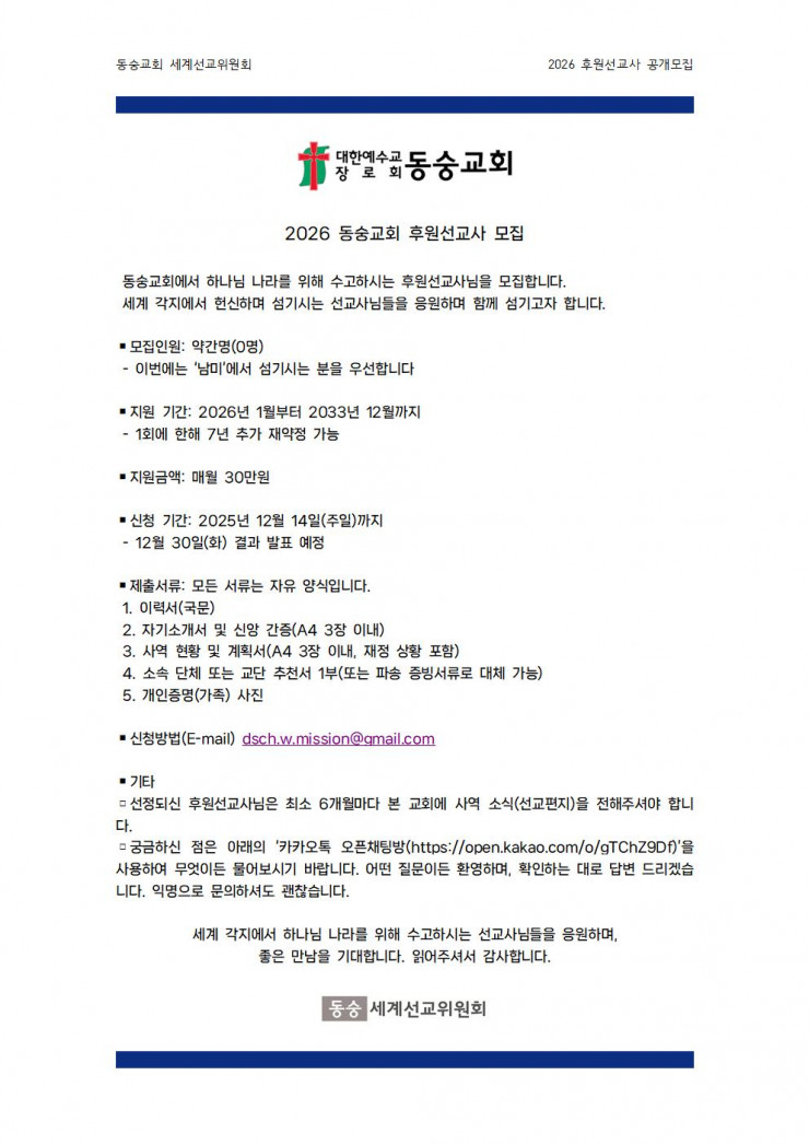 동숭교회 후원선교사 모집 페이지 정보 작성자 남진희 작성일25-11-20 14:32 조회12회 댓글0건 다음글 목록 ⊙ 구인 정보 현재 진행 상태 구인중 모집 분야 세계선교위원회 고용형태 정규직 모집 인원 123 명 급여 조건 월 30만원 모집 마감일 2025년 12월 14일 ⊙ 단체/교회 정보 회사/단체/교회이름 동숭교회 전화번호 02-743-0017 본문 댓글목록 등록된 댓글이 없습니다. 다음글 목록