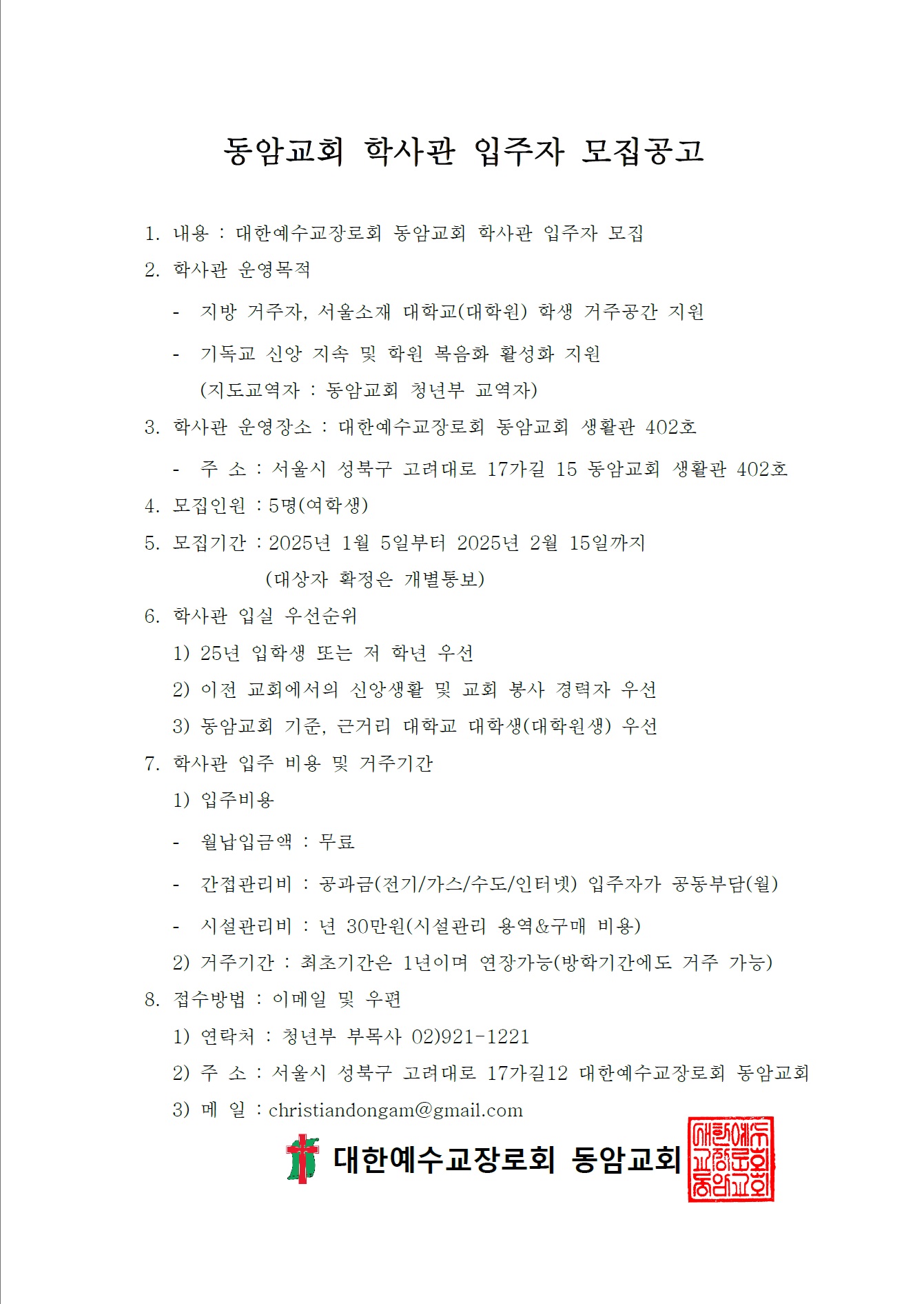 동암교회에서 서울 소재 대학교 학생의 거주 공간을 지원하고자 학사관을 만들고 학생을 모집합니다.