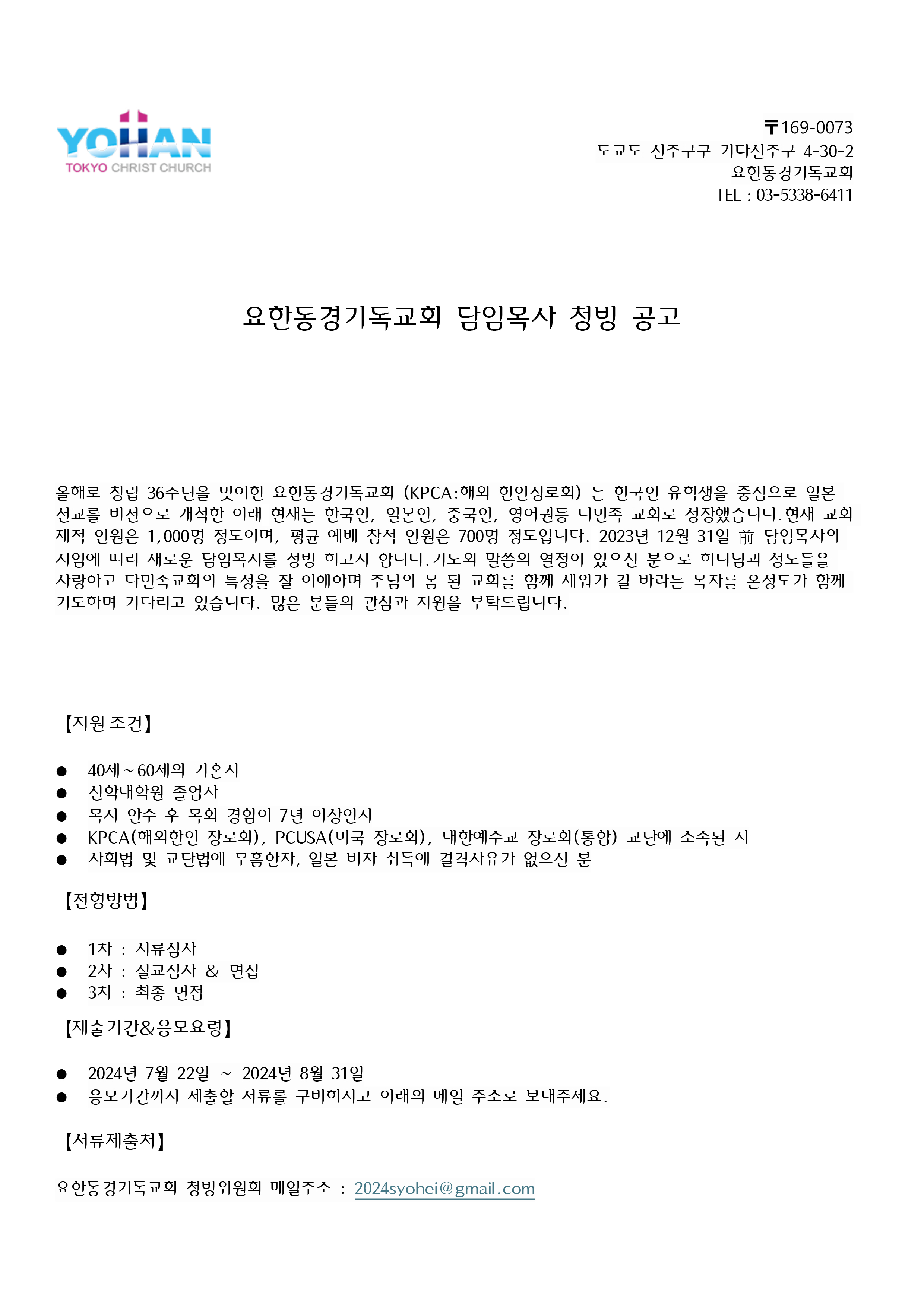 요한 동경 교회에서 담임 목사님을 청빙합니다.
