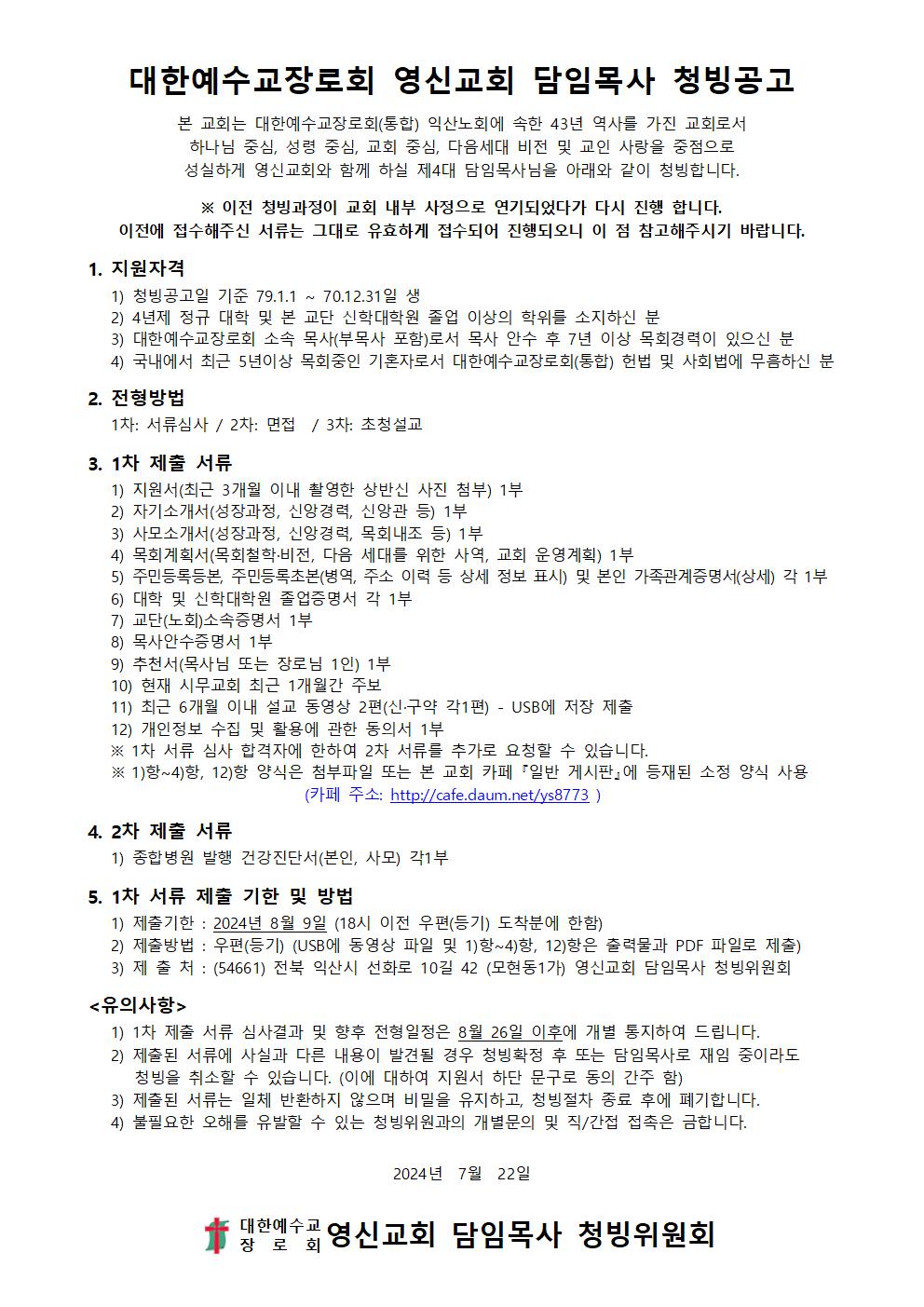 익산 영신교회에서 담임목사님을 청빙합니다.