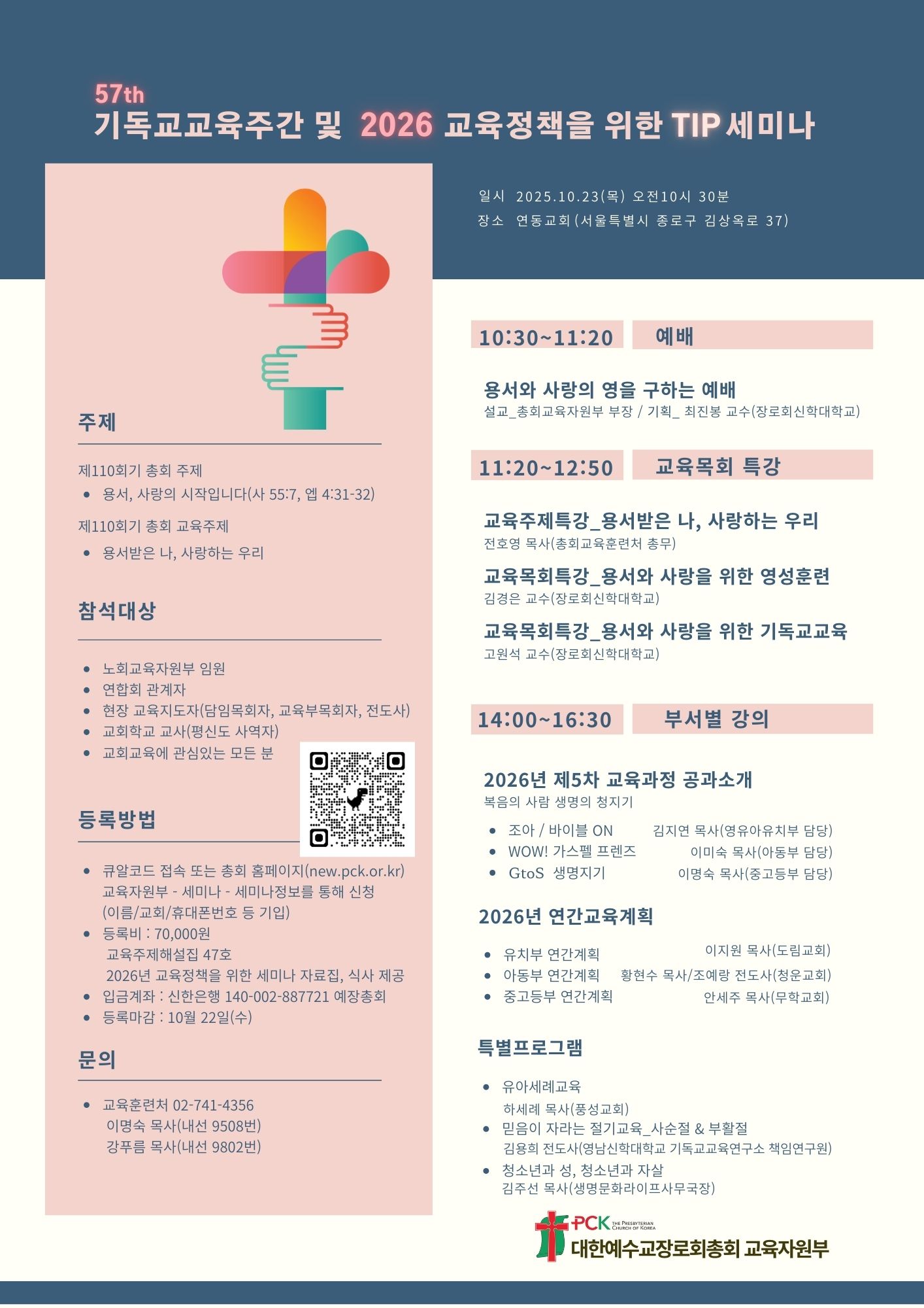 | 참여방법 | 큐알코드 접속 또는 총회 홈페이지(new.pck.or.kr)의 교육자원부 페이지를 통해 신청 후 입금 |