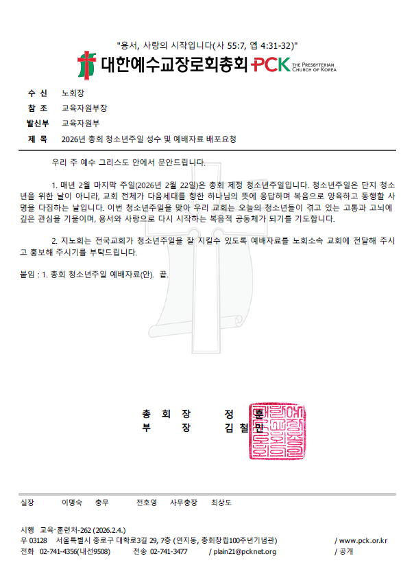 2026년 총회청소년주일(2월 22일) 성수 및 예배자료 배포요청