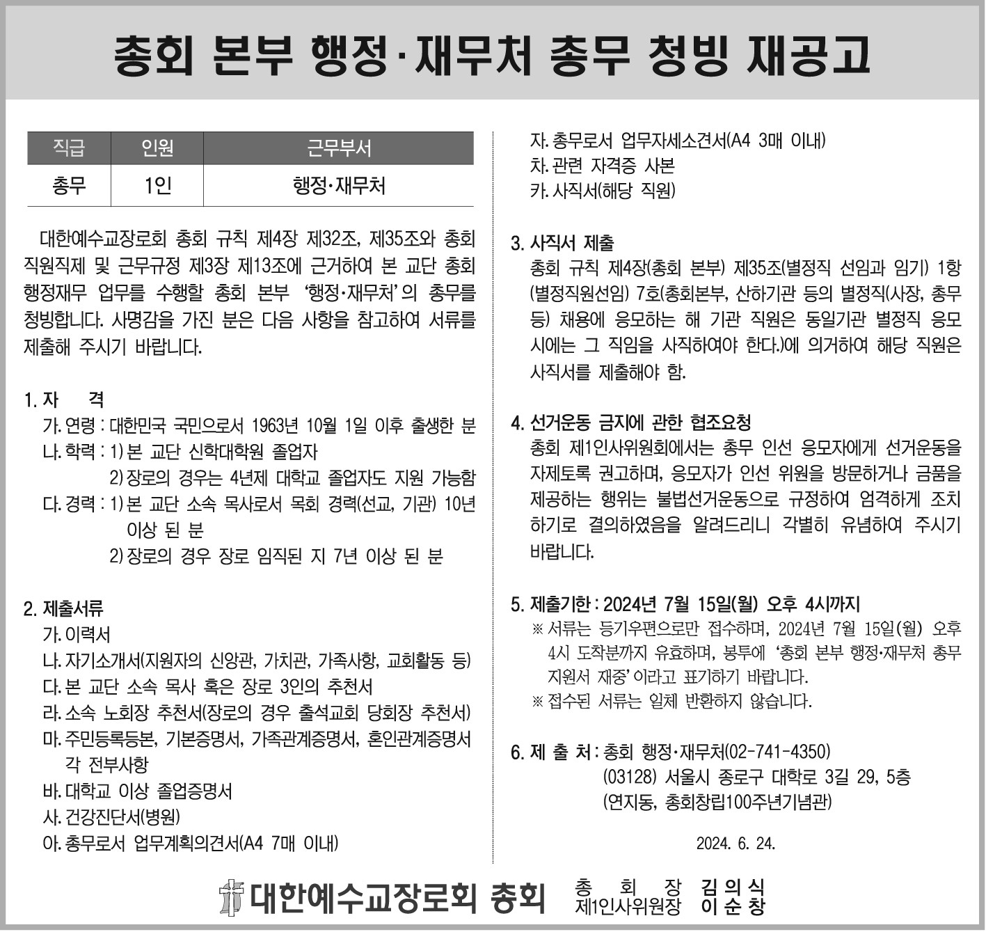 총회 본부 행정·재무처 총무 청빙 재공고(7월 15일 오후4시까지)