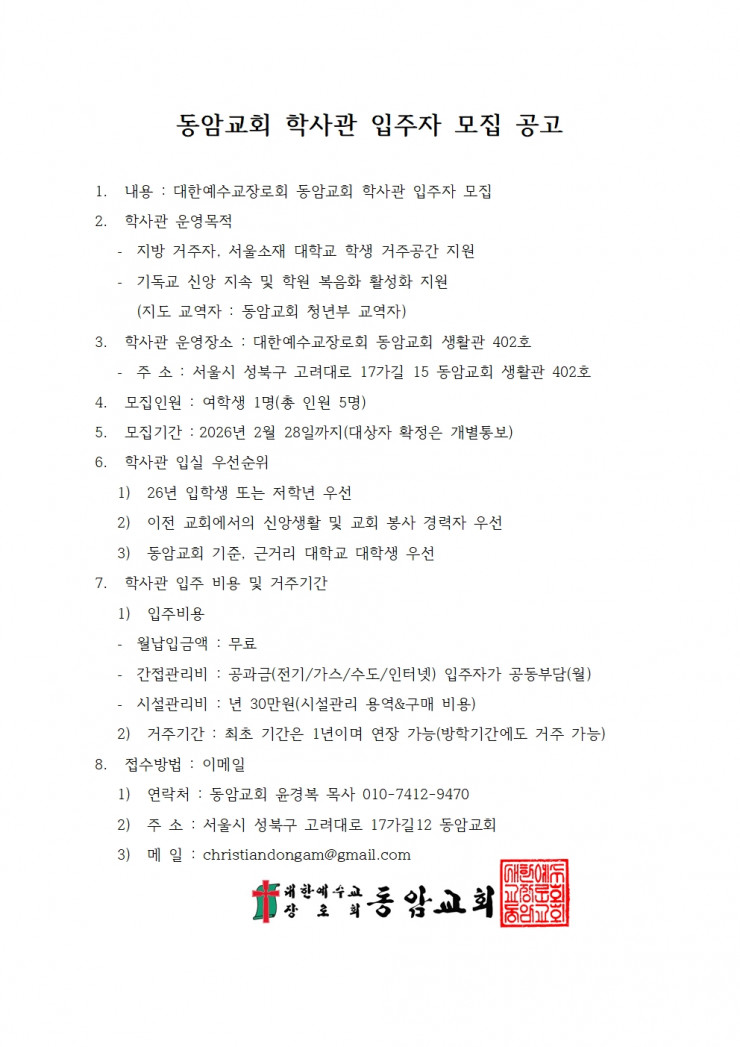 교회 홈페이지 동암마당-자료실에 있는 '2026 동암교회 학사관 입주자 모집 공고'를 참고하셔서 지원해 주시기를 바랍니다.