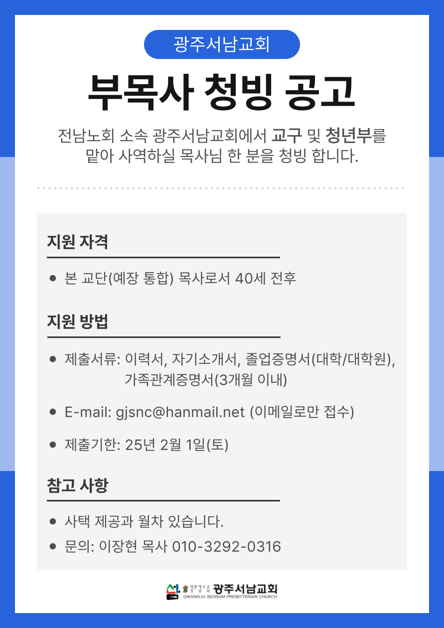 광주서남교회에서 부목사(교구 및 청년)를 청빙 합니다.